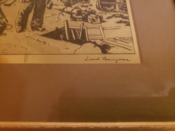 Pair of vintage framed foil etchings of paintings done by the late actor Lionel Barrymore. Circa 1950s/60s. Each measuring 9.5"x11". Nice condition.
