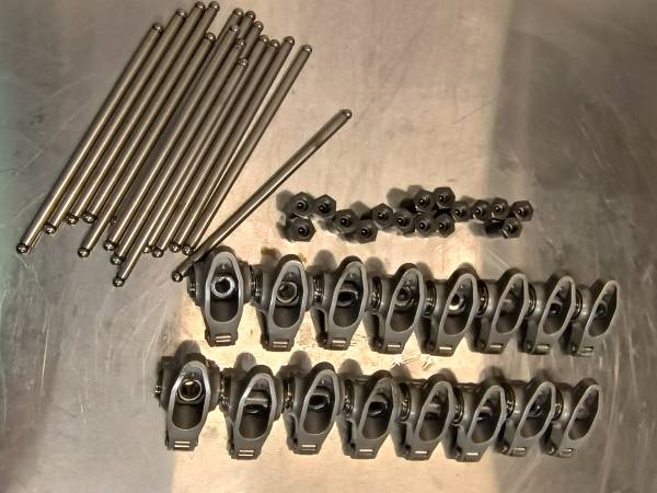 Comp cams steel roller rockers 3/8ths stud 1.6 ratio with pushrods $325, flywheel $50, centerforce clutch with pressure plate $50, crankshaft pulley $10, valve covers $225, waterpump $10, msd...